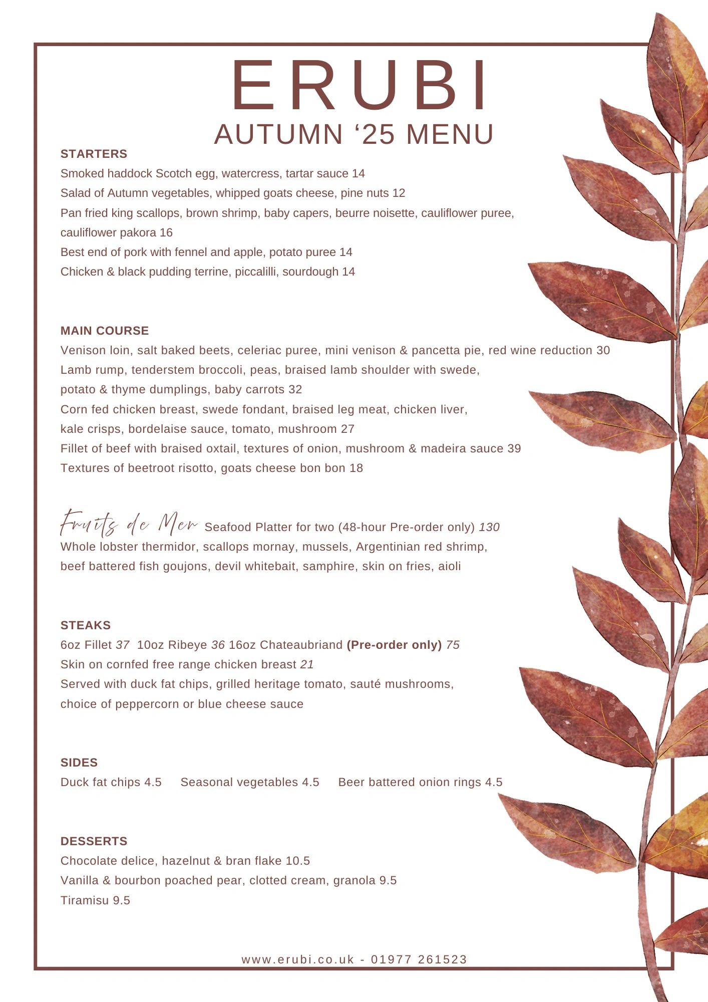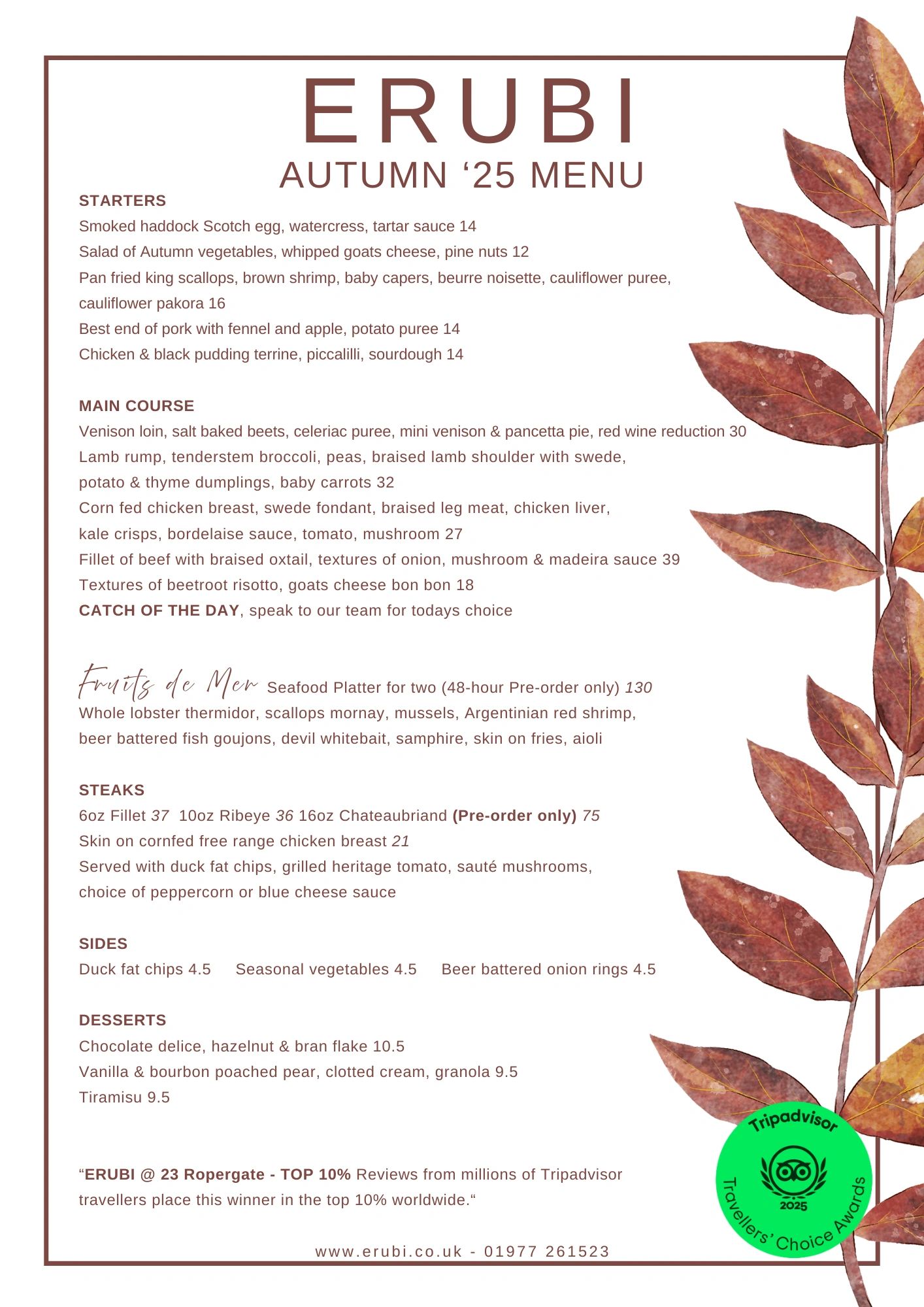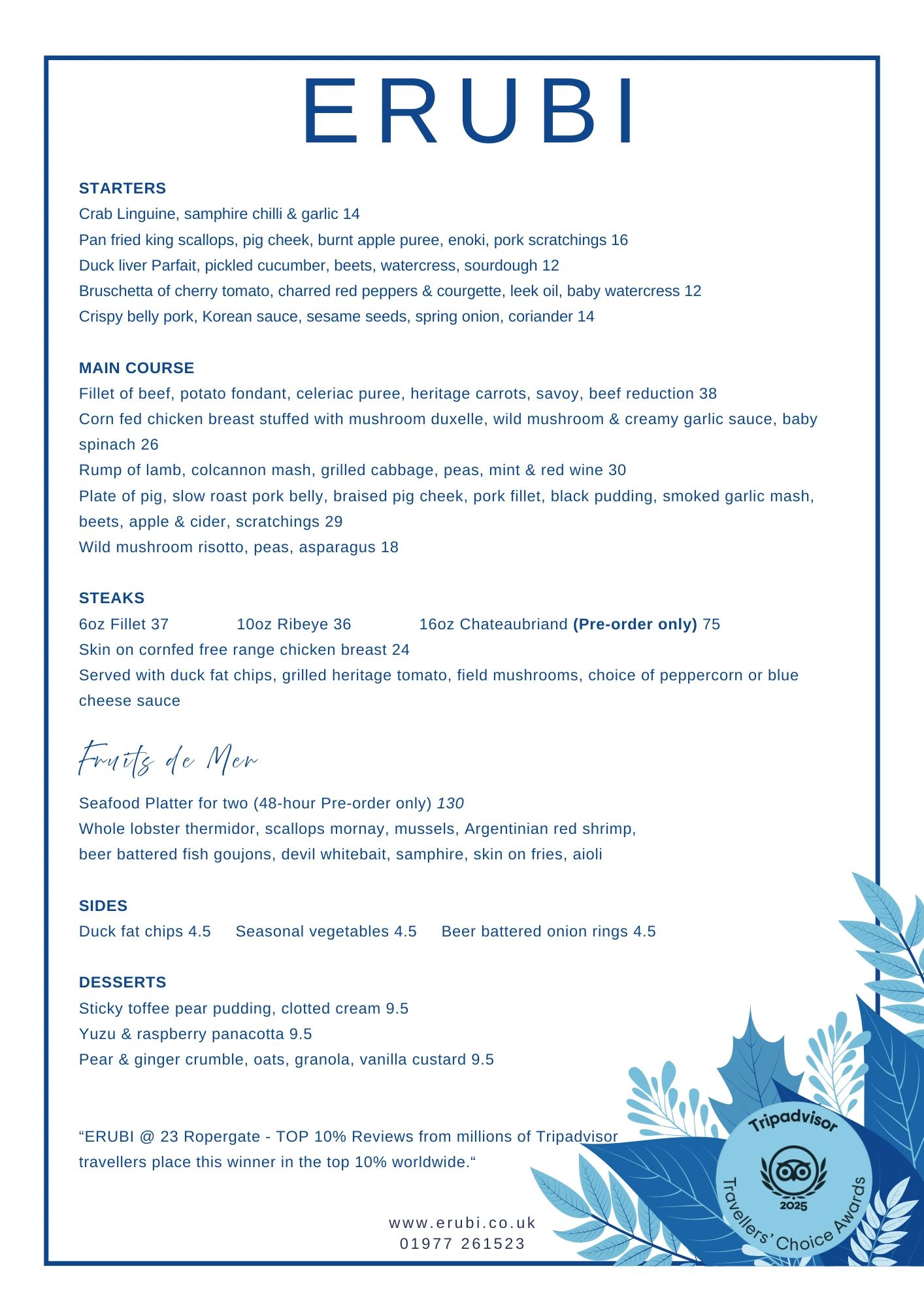 Add a selection of starters and desserts, our comprehensive wine list, and you have the makings of the perfect evening.